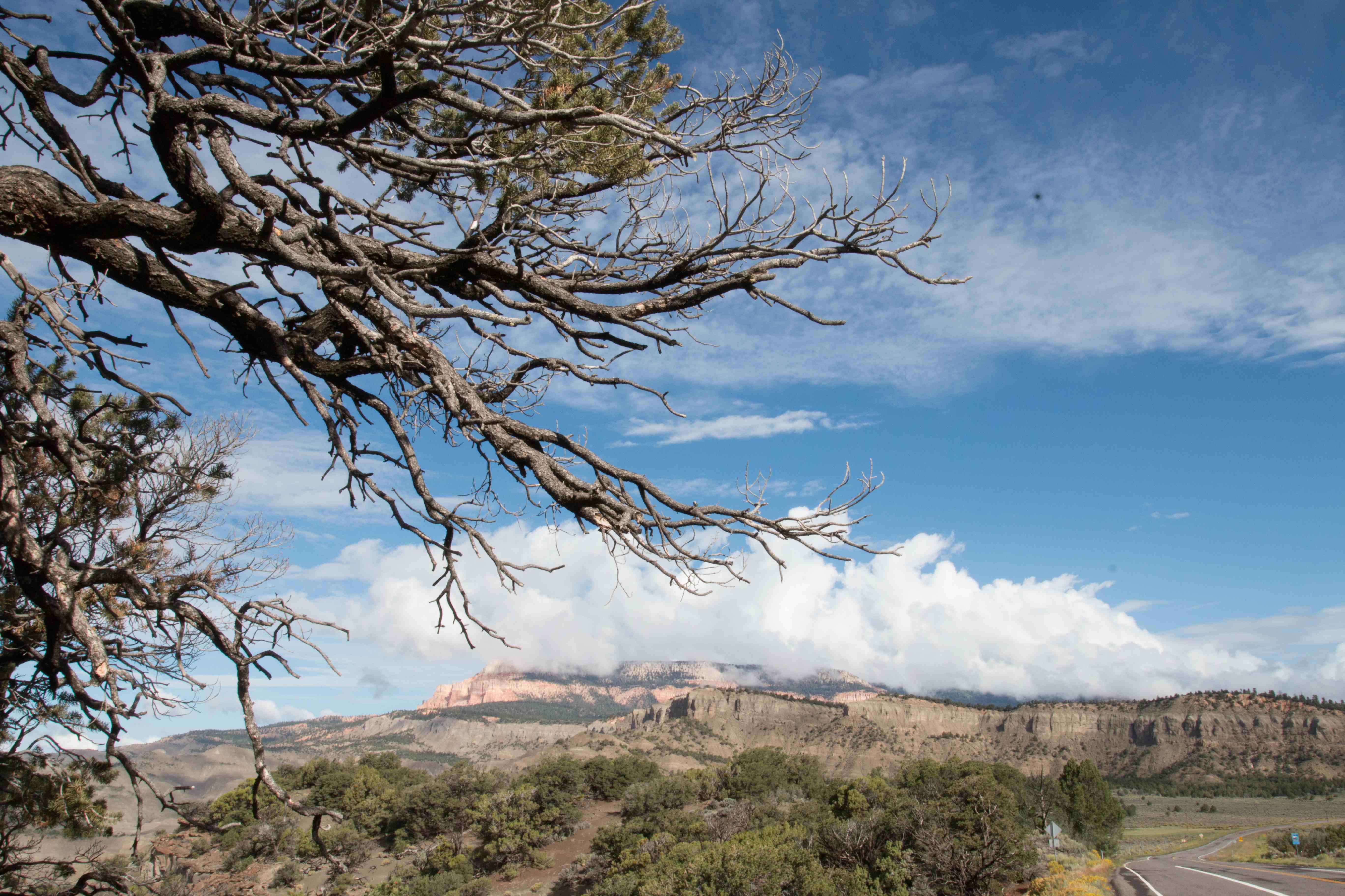 After breakfast, we got on Hwy 12 and our destination was Escalante Petrified Forest State Park. We stopped a couple of places on the way. To our surprise, the sun was out.